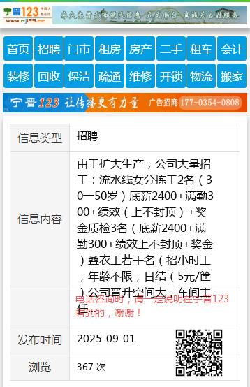 由于扩大生产,公司大量招工:流水线女分拣工2名(30一50岁)底薪2400+满勤300+绩效(上不封顶)+奖金质检3名(底薪2400+满勤300+绩效上不封顶+奖金)叠衣工若干名(招小时工,年龄不限,日结(5元/筐)公司晋升空间大,车间主任,厂长一职等你来,只要你有能力,利丰公司永远给你机会!选择利丰,让你富贵一生!!试用期3天。额满为止!早7:30一16:30中午管饭!厂址:新兴区宝泰隆路26号。公交路线:坐(走葫芦头沟的)1路公交车到(家居广场)站点前走100米恒阳科技公司红大门院内。☎️13946506087王总13946506087 【电话咨询时,请一定说明在七台河信息网看到的,谢谢!】 |