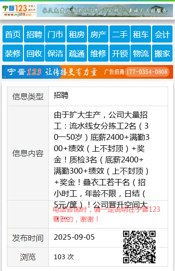 由于扩大生产,公司大量招工:流水线女分拣工2名(30一50岁)底薪2400+满勤300+绩效(上不封顶)+奖金!质检3名(底薪2400+满勤300+绩效(上不封顶)+奖金!叠衣工若干名(招小时工,年龄不限,日结(5元/筐)!公司晋升空间大,车间主任,厂长一职等你来,只要你有能力,利丰公司永远给你施展的空间!选择利丰,让你富贵一生!!试用期3天。额满为止!早7:30一16:30中午管饭!厂址:新兴区宝泰隆路26号。公交路线:坐(走葫芦头沟的)1路公交车到(家居广场)站点前走100米恒阳科技公司红大门院内。☎️13946506087王总13946506087 【电话咨询时,请一定说明在七台河信息网看到的,谢谢!】 |