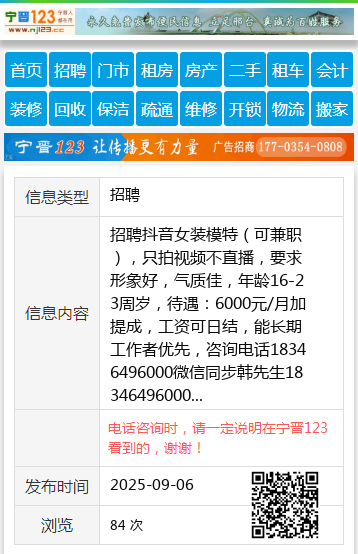 招聘抖音女装模特(可兼职),只拍视频不直播,要求形象好,气质佳,年龄16-23周岁,待遇:6000元/月加提成,工资可日结,能长期工作者优先,咨询电话18346496000微信同步韩先生18346496000 【电话咨询时,请一定说明在七台河信息网看到的,谢谢!】 |