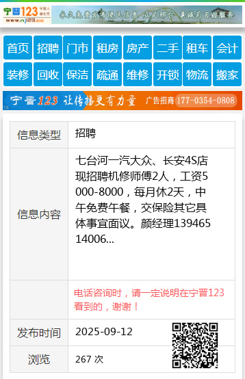 七台河一汽大众、长安4S店现招聘机修师傅2人,工资5000-8000,每月休2天,中午免费午餐,交保险其它具体事宜面议。颜经理13946514006 【电话咨询时,请一定说明在七台河信息网看到的,谢谢!】 |