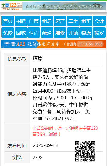 比亚迪腾辉4S店招聘汽车主播2-5人,要求有较好的沟通能力以及学习能力,薪酬每月4000+加绩效工资,工作时间为早9:00—17:00,每月带薪休假2天。中午提供免费午餐,期待你加入!颜经理15304671797 【电话咨询时,请一定说明在七台河信息网看到的,谢谢!】 |