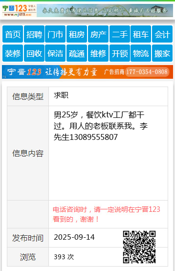 男25岁,餐饮ktv工厂都干过。用人的老板联系我。李先生13089555807