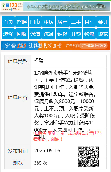 1.招聘外卖骑手有无经验均可,主要工作就是送餐,认识字即可工作,入职当天免费提供电动车。送全新装备。保底月收入8000元-10000元,上不封顶。入职享受新人奖1000元,入职享受阶段奖,拿到你手软累计获得11000元。人来即可工作。可兼职可全职.有专人指导。领着你跑。软件自带导航,自带地图。精准到小区楼号。另招聘兼职骑手,工资4000-6000工作时间自由安排。2.全职工作时间:早6-晚6.早9晚9.中午11-晚12点三班倒.中午休息2小时.3.岗位要求:18周岁-50周岁会骑电动车或者摩托车。会用智能手机,会使用导航即可有专人指导教学。不用担心找不到地址也:不要担心不会干,人来即可上岗.工作地点:桃山区,茄子区,新兴区3站点都可以入职。联系电话:18746402070(同步微信)俄了么18746402070 【电话咨询时,请一定说明在七台河信息网看到的,谢谢!】 |