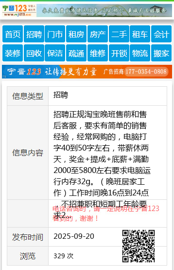 招聘正规淘宝晚班售前和售后客服,要求有简单的销售经验,经常网购的,电脑打字40到50字左右,带薪休两天,奖金+提成+底薪+满勤2000至5800左右要求电脑运行内存32g。(晚班居家工作)工作时间晚16点到24点,不招兼职和短期工年龄要求24周岁到40内人事专18304668323 【电话咨询时,请一定说明在七台河信息网看到的,谢谢!】 |