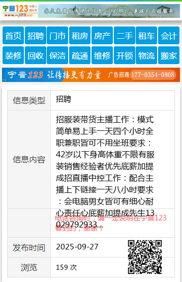 招服装带货主播工作:模式简单易上手一天四个小时全职兼职皆可不用坐班要求:42岁以下身高体重不限有服装销售经验者优先底薪加提成招直播中控工作:配合主播上下链接一天八小时要求:会电脑男女皆可有细心耐心责任心底薪加提成先生13029792933 【电话咨询时,请一定说明在七台河信息网看到的,谢谢!】 |