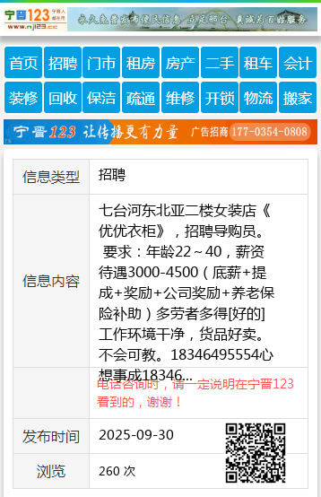 七台河东北亚二楼女装店《优优衣柜》,招聘导购员。 要求:年龄22~40,薪资待遇3000-4500(底薪+提成+奖励+公司奖励+养老保险补助)多劳者多得[好的] 工作环境干净,货品好卖。不会可教。18346495554心想事成18346495554 【电话咨询时,请一定说明在七台河信息网看到的,谢谢!】 |
