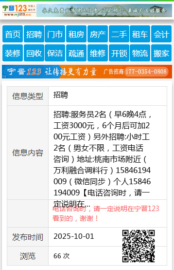 招聘:服务员2名(早6晚4点,工资3000元,6个月后可加200元工资)另外招聘:小时工2名(男女不限,工资电话咨询)地址:桃南市场附近(万利融合调料行)15846194009(微信同步)个人15846194009 【电话咨询时,请一定说明在七台河信息网看到的,谢谢!】 |