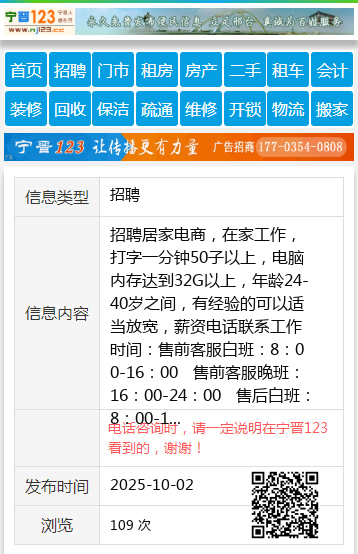 招聘居家电商,在家工作,打字一分钟50子以上,电脑内存达到32G以上,年龄24-40岁之间,有经验的可以适当放宽,薪资电话联系工作时间:售前客服白班:8:00-16:00 售前客服晚班:16:00-24:00 售后白班:8:00-16:00; 售后晚班:16:00-24:00,带薪休假2天。不接受兼职 不接受短期工,同行业蹭学习的请绕路!!!电话联系,13945577963。个人13945577963 【电话咨询时,请一定说明在七台河信息网看到的,谢谢!】 |