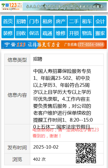 中国人寿招募保险服务专员1、年龄满23-502、初中及以上学历3、年龄符合25周岁以上且学历大专以上学历可优先录取。4.工作内容主要负责售后服务,对公司的老客户维护进行保单续收的提醒工作时间1、8:20--15:00上五休二,国家法定节假日休息2、下午时间可合理安排(如有宝妈下班也不影响接小孩)联系人:王女士联系电话:15846400166个人15846400166 【电话咨询时,请一定说明在七台河信息网看到的,谢谢!】 |
