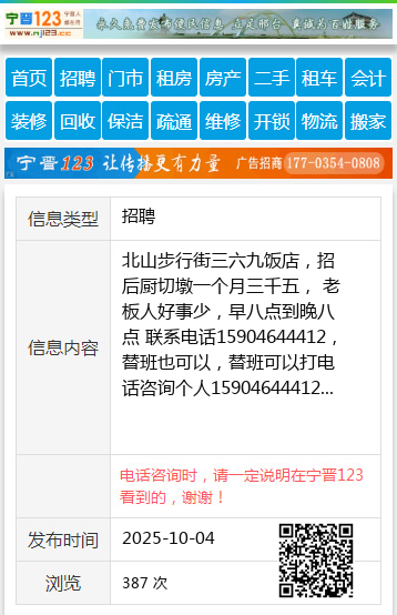 北山步行街三六九饭店,招后厨切墩一个月三千五, 老板人好事少,早八点到晚八点 联系电话15904644412,替班也可以,替班可以打电话咨询个人15904644412 【电话咨询时,请一定说明在七台河信息网看到的,谢谢!】 |
