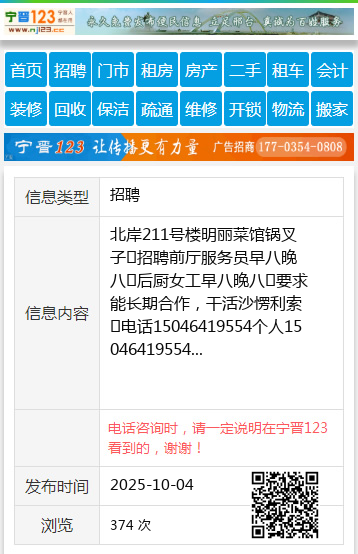 北岸211号楼明丽菜馆锅叉子招聘前厅服务员早八晚八后厨女工早八晚八要求能长期合作,干活沙愣利索电话15046419554个人15046419554 【电话咨询时,请一定说明在七台河信息网看到的,谢谢!】 |
