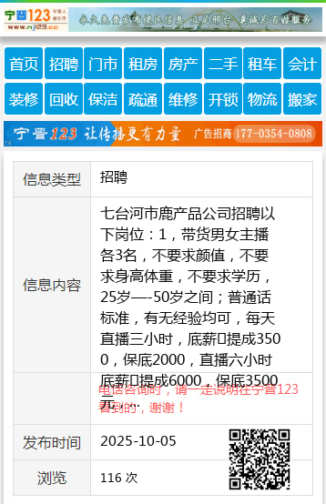 七台河市鹿产品公司招聘以下岗位:1,带货男女主播各3名,不要求颜值,不要求身高体重,不要求学历,25岁—-50岁之间;普通话标准,有无经验均可,每天直播三小时,底薪➕提成3500,保底2000,直播六小时底薪➕提成6000,保底3500元, 2,直播间中控(直播间助理):男女均可,25—45岁,熟练掌握电脑,会平面设计者优先,底薪:2300+车饭补=2600--3500元,超出工作时间加薪面议;无学历,身高体重等其他要求,只要你努力;3,拍摄剪辑人员2人,男女不限,25--45岁之间,会拍摄剪辑,底薪,3300+车饭补=若干,面试合格定薪资,微信联系电话:17713356607,鹿i,微信注明招聘个人17713356607 【电话咨询时,请一定说明在七台河信息网看到的,谢谢!】 |