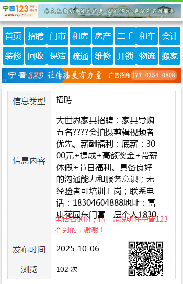 大世界家具招聘:家具导购五名????会拍摄剪辑视频者优先。薪酬福利:底薪:3000元+提成+高额奖金+带薪休假+节日福利。具备良好的沟通能力和服务意识;无经验者可培训上岗;联系电话:18304604888地址:富康花园东门富一层个人18304604888 【电话咨询时,请一定说明在七台河信息网看到的,谢谢!】 |