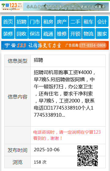 招聘司机带跑事工资¥4000,早7晚5.另招聘做饭阿姨,中午一顿饭打扫,办公室卫生,还有住宅,要求干净利索,早7晚5,工资2000,联系电话☎️17745338910个人17745338910 【电话咨询时,请一定说明在七台河信息网看到的,谢谢!】 |