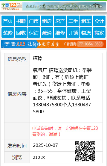 氧气厂 招聘送货司机:带装卸,B证,有(危险上岗证者优先)货运上岗证,年龄:35--55,身体健康,工资面议,非诚勿扰,联系电话13804875800个人13804875800 【电话咨询时,请一定说明在七台河信息网看到的,谢谢!】 |