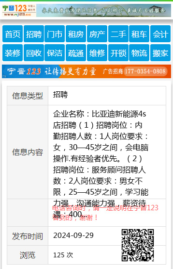 企业名称:比亚迪新能源4s店招聘(1)招聘岗位:内勤招聘人数:1人岗位要求:女,30—45岁之间,会电脑操作.有经验者优先。(2)招聘岗位:服务顾问招聘人数:2人岗位要求:男女不限,25—45岁之间,学习能力强,沟通能力强,薪资待遇:4000-5000元(3)招聘岗位:司机招聘人数:2人岗位要求:男,年龄25—40岁之间.有三年以上驾驶经验.面试携带驾驶证。薪资待遇:面议(4)招聘岗位:销售顾问招聘人数:6人岗位要求:男女不限,年龄22—45岁之间,有无经验均可报名.有销售经验者优先。薪资待遇:4000-8000元(5)招聘岗位:客服招聘人数:2人岗位要求:女,年龄25-40岁之间熟练使用办公软件有客服相关工作经验者优先。(6)招聘岗位:刷车工招聘人数:2人岗位要求:男,女不限40—50岁之间,有相关工作经验者优先。(7)招聘岗位:钣金师傅钣金喷漆招聘人数:2人岗位要求:男,25—45岁之间,有相关工作经验者优先。(8)招聘岗位:会计招聘人数:1人岗位要求:女,28—35岁之间,有4S店工作经验者优先。(9)招聘岗位:电工招聘人数:1人岗位要求:男,50—59岁之间,有电工证.有相关工作经验者优先。(10)招聘岗位:总经理助理招聘人数:1人要求:男,已婚.年龄30—35岁之间.大学本科学历以上。薪资待遇:面议薪资待遇:工作时间早8:00-17:00点以上岗位,工资面议,食堂餐补,每月两天带薪休假,工作满半年后交社保。联系电话:13946544294工作地址:七台河市桃山区六闾道口比亚迪新能源4s店联系人:夏女士夏女士13946544294 【电话咨询时,请一定说明在七台河信息网看到的,谢谢!】 |