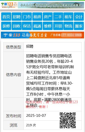 招聘电话销售专员招聘电话销售业务员20名,年龄20-45岁男女均可老带新培训机制有无经验均可。工作地址山上二转盘附近北岸5号道商贸城均可工作时间:早8.30-晚5点每周日带薪休息每天工作8小时,中午休息一小时。底薪+满勤2800普通员工综合工资4-8000精英员工8-12000,不要想着拿底薪公司没有拿底薪的员工公司员工70➕目前精英单王工资15000薪资真实无水分只要你努力,必须有回报。地址:七台河桃山区多伦多对面联系人:崔先生微信:17788774343联系方式:18904645551崔先生18904645551 【电话咨询时,请一定说明在七台河信息网看到的,谢谢!】 |
