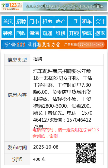 汽车配件商店招聘要求年龄18一35周岁男女不限。干活干净利落。工作时间早7.30晚6.00。负责店里货品出货和摆放。活轻松不累。工资待遇2800-3000。满勤200。能长干者优先。电话:15704641273微信:15704641273电话不通加微信个人15704641273 【电话咨询时,请一定说明在七台河信息网看到的,谢谢!】 |