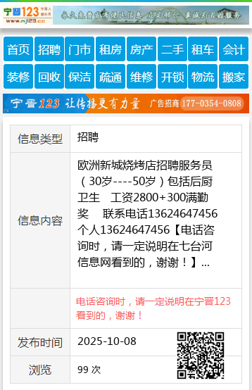 欧洲新城烧烤店招聘服务员(30岁----50岁)包括后厨卫生 工资2800+300满勤奖 联系电话13624647456个人13624647456 【电话咨询时,请一定说明在七台河信息网看到的,谢谢!】 |