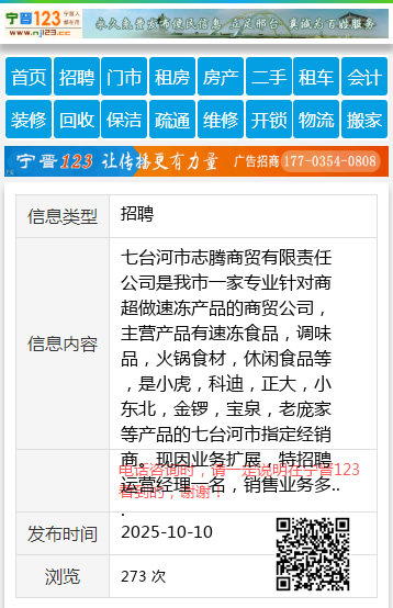 七台河市志腾商贸有限责任公司是我市一家专业针对商超做速冻产品的商贸公司,主营产品有速冻食品,调味品,火锅食材,休闲食品等,是小虎,科迪,正大,小东北,金锣,宝泉,老庞家等产品的七台河市指定经销商。现因业务扩展,特招聘运营经理一名,销售业务多名,工资5000+按销售业绩提成,销售越多工资越高,要求品貌端庄,有一定的销售谈判能力,建设组织架构能力负责组建销售团队,并且相关工作一年以上的工作经验,有意者请联系,微信电话同号15046406678.个人15046406678 【电话咨询时,请一定说明在七台河信息网看到的,谢谢!】 |