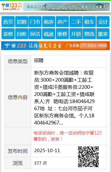 新东方商务会馆诚聘:收银员:3000+200满勤+工龄工资+提成汗蒸服务员:2200+200满勤+工龄工资+提成联系人:齐 艳电话:18404642967地 址:七台河市茄子河区新东方商务会馆。个人18404642967 【电话咨询时,请一定说明在七台河信息网看到的,谢谢!】 |