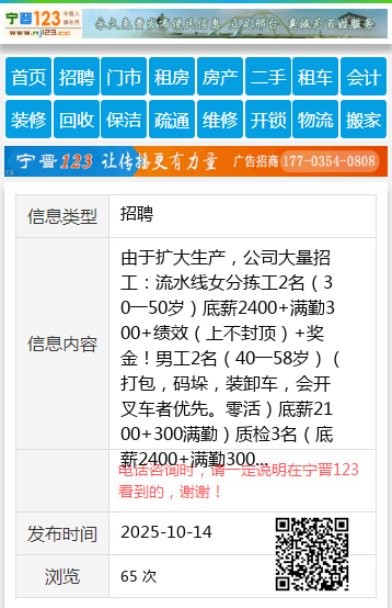 由于扩大生产,公司大量招工:流水线女分拣工2名(30一50岁)底薪2400+满勤300+绩效(上不封顶)+奖金!男工2名(40一58岁)(打包,码垛,装卸车,会开叉车者优先。零活)底薪2100+300满勤)质检3名(底薪2400+满勤300+绩效)公司晋升空间大,车间主任,厂长一职等你来,只要你有能力,利丰公司永远给你施展的空间!选择利丰,让你富贵一生!!试用期3天。额满为止!早7:30一16:30中午管饭!厂址:新兴区宝泰隆路26号。公交路线:坐(走葫芦头沟的)1路公交车到(家居广场)站点前走100米恒阳科技公司红大门院内。☎️13946506087个人13946506087 【电话咨询时,请一定说明在七台河信息网看到的,谢谢!】 |