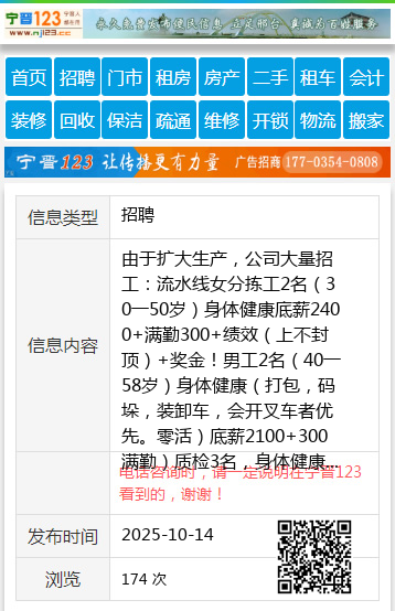 由于扩大生产,公司大量招工:流水线女分拣工2名(30一50岁)身体健康底薪2400+满勤300+绩效(上不封顶)+奖金!男工2名(40一58岁)身体健康(打包,码垛,装卸车,会开叉车者优先。零活)底薪2100+300满勤)质检3名,身体健康(底薪2400+满勤300+绩效)司炉工一名年年龄不限,身体健康,早5点一8点烧锅炉!工资600元公司晋升空间大,车间主任,厂长一职等你来,只要你有能力,利丰公司永远给你施展的空间!选择利丰,让你富贵一生!!试用期3天。额满为止!早7:30一16:30中午管饭!厂址:新兴区宝泰隆路26号。公交路线:坐(走葫芦头沟的)1路公交车到(家居广场)站点前走100米恒阳科技公司红大门院内。☎️13946506087王总13946506087 【电话咨询时,请一定说明在七台河信息网看到的,谢谢!】 |