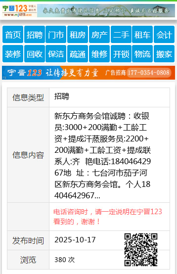 新东方商务会馆诚聘:收银员:3000+200满勤+工龄工资+提成汗蒸服务员:2200+200满勤+工龄工资+提成联系人:齐 艳电话:18404642967地 址:七台河市茄子河区新东方商务会馆。个人18404642967 【电话咨询时,请一定说明在七台河信息网看到的,谢谢!】 |