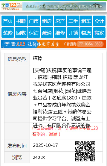 [庆祝][庆祝]重要的事说三遍,招聘! 招聘! 招聘!黑龙江我爱我家医药连锁有限公司七台河店[烟花][烟花]诚聘营业员若干名底薪1800+绩效+单品提成价年终绩效奖金福利待遇:五险+带薪休息公司提供学习平台、诚邀有上进心、有团队合作意识的你加入我们工作地点:北岸 桃山☎️13351266520个人13351266520 【电话咨询时,请一定说明在七台河信息网看到的,谢谢!】 |