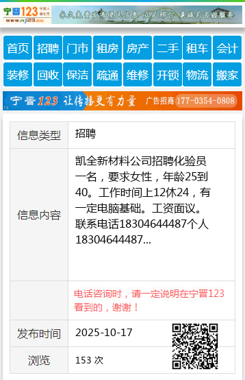 凯全新材料公司招聘化验员一名,要求女性,年龄25到40。工作时间上12休24,有一定电脑基础。工资面议。联系电话18304644487个人18304644487 【电话咨询时,请一定说明在七台河信息网看到的,谢谢!】 |