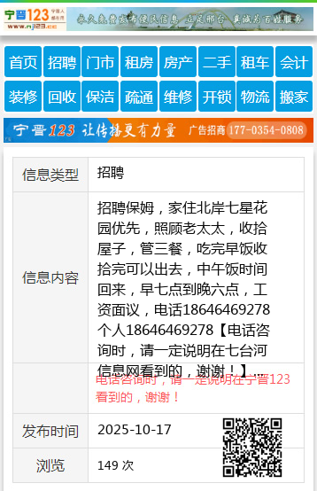 招聘保姆,家住北岸七星花园优先,照顾老太太,收拾屋子,管三餐,吃完早饭收拾完可以出去,中午饭时间回来,早七点到晚六点,工资面议,电话18646469278个人18646469278 【电话咨询时,请一定说明在七台河信息网看到的,谢谢!】 |
