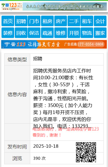 招聘优秀服务员店内工作时间10:00-21:00要求:有长性,女性(30-55岁),干活麻利,撒冷利索,有笑脸,善于沟通,性格阳光开朗。薪资:3500元(加个人能力奖)每月1号开资不压资,店内无是非,欢迎优秀的你加入我们。电话:13329322725个人13329322725 【电话咨询时,请一定说明在七台河信息网看到的,谢谢!】 |