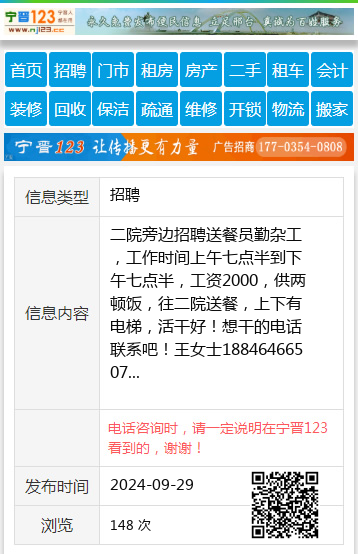 二院旁边招聘送餐员勤杂工,工作时间上午七点半到下午七点半,工资2000,供两顿饭,往二院送餐,上下有电梯,活干好!想干的电话联系吧!王女士18846466507 【电话咨询时,请一定说明在七台河信息网看到的,谢谢!】 |