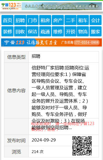 倍舒特厂家招聘:招聘岗位:运营经理岗位要求:1)保障省区导购员会议、专车会议、一级人员管理及运营,建立起一级人员、导购员、专车业务的晋升及运营体系;2)能够及时对于一级人员、导购员、专车业务评估,做好会议及时激励;3)在现场能够做到空岗招聘工作;可接受长期出差工作地点:黑龙江省工资待遇:8000-10000,五险一金,单休,交通补助,话补联系电话:18904640605夏女士18904640605 【电话咨询时,请一定说明在七台河信息网看到的,谢谢!】 |