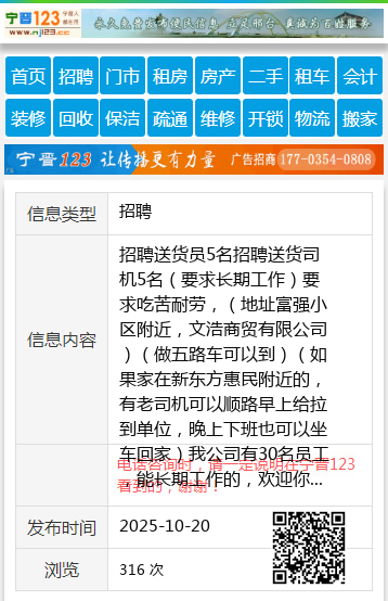 招聘送货员5名招聘送货司机5名(要求长期工作)要求吃苦耐劳,(地址富强小区附近,文浩商贸有限公司)(做五路车可以到)(如果家在新东方惠民附近的,有老司机可以顺路早上给拉到单位,晚上下班也可以坐车回家)我公司有30名员工,能长期工作的,欢迎你的加入电话1864649888213199231100个人18646498882 【电话咨询时,请一定说明在七台河信息网看到的,谢谢!】 |