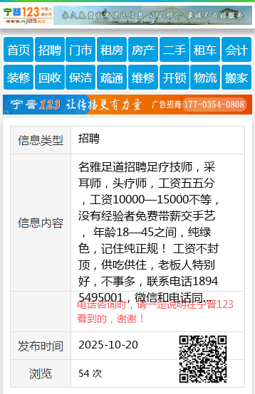 名雅足道招聘足疗技师,采耳师,头疗师,工资五五分,工资10000—15000不等,没有经验者免费带薪交手艺, 年龄18—45之间,纯绿色,记住纯正规! 工资不封顶,供吃供住,老板人特别好,不事多,联系电话18945495001,微信和电话同步个人18945495001 【电话咨询时,请一定说明在七台河信息网看到的,谢谢!】 |