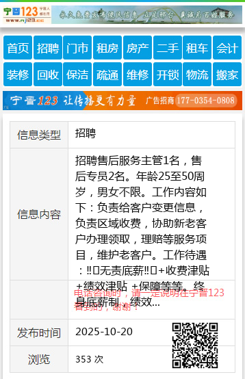 招聘售后服务主管1名,售后专员2名。年龄25至50周岁,男女不限。工作内容如下:负责给客户变更信息,负责区域收费,协助新老客户办理领取,理赔等服务项目,维护老客户。工作待遇:‼️无责底薪‼️+收费津贴+绩效津贴 +保障等等。终身底薪制,绩效上不封顶,工作时间相对自由。工作地点:桃山区欢迎自荐或者推荐电话或者微信: 张经理13945587907个人13945587907 【电话咨询时,请一定说明在七台河信息网看到的,谢谢!】 |