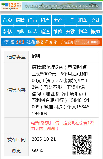 招聘:服务员2名(早6晚4点,工资3000元,6个月后可加200元工资)另外招聘:小时工2名(男女不限,工资电话咨询)地址:桃南市场附近(万利融合调料行)15846194009(微信同步)个人15846194009 【电话咨询时,请一定说明在七台河信息网看到的,谢谢!】 |