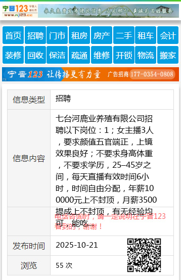 七台河鹿业养殖有限公司招聘以下岗位:1;女主播3人,要求颜值五官端正,上镜效果良好;不要求身高体重,不要求学历,25–45岁之间,每天直播有效时间6小时,时间自由分配,年薪100000元上不封顶,月薪3500提成上不封顶,有无经验均可,能吃苦耐劳,执行力强,有团队精神。(吹毛求疵,斤斤计较者勿扰)2;视频剪辑拍摄人员,(可兼职)薪资面议;3;直播间中控1人,男女不限,25-45岁之间,每天工作有效时间9小时,工作轻松不累;月薪保底2800➕提成上不封顶,熟悉电脑,有责任心,有无经验均可。4;客服➕助播,女,25–45岁之间,每天有效工作时间9小时,月薪保底2600➕提成上不封顶,有无经验均可;以上岗位丰厚。工作地点:欧洲新城26楼,四号、五号商服,七台河鹿业养殖有限公司。联系电话:17713356607,鹿先生个人17713356607 【电话咨询时,请一定说明在七台河信息网看到的,谢谢!】 |