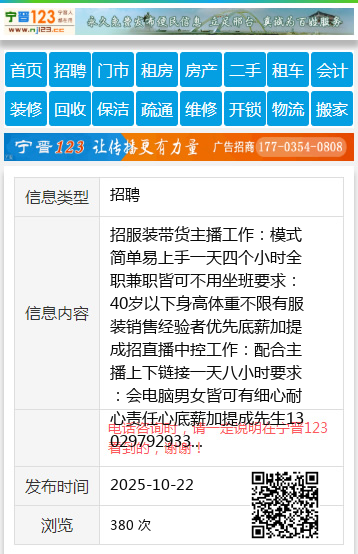 招服装带货主播工作:模式简单易上手一天四个小时全职兼职皆可不用坐班要求:40岁以下身高体重不限有服装销售经验者优先底薪加提成招直播中控工作:配合主播上下链接一天八小时要求:会电脑男女皆可有细心耐心责任心底薪加提成先生13029792933 【电话咨询时,请一定说明在七台河信息网看到的,谢谢!】 |