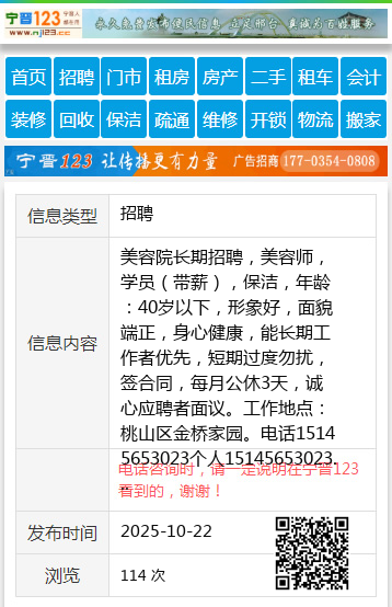 美容院长期招聘,美容师,学员(带薪),保洁,年龄:40岁以下,形象好,面貌端正,身心健康,能长期工作者优先,短期过度勿扰,签合同,每月公休3天,诚心应聘者面议。工作地点:桃山区金桥家园。电话15145653023个人15145653023 【电话咨询时,请一定说明在七台河信息网看到的,谢谢!】 |