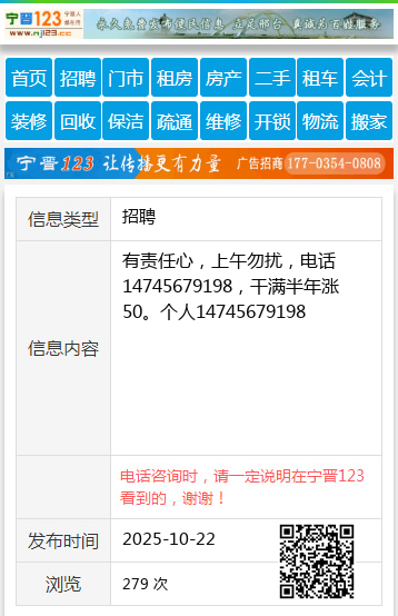有责任心,上午勿扰,电话14745679198,干满半年涨50。个人14745679198