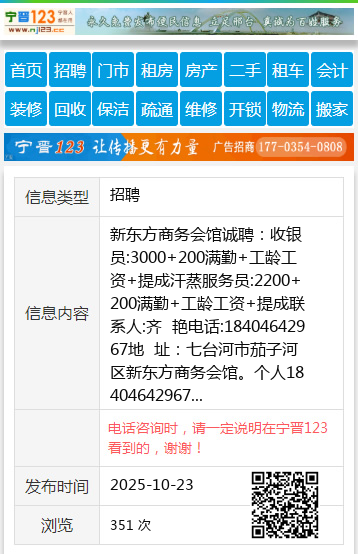 新东方商务会馆诚聘:收银员:3000+200满勤+工龄工资+提成汗蒸服务员:2200+200满勤+工龄工资+提成联系人:齐 艳电话:18404642967地 址:七台河市茄子河区新东方商务会馆。个人18404642967 【电话咨询时,请一定说明在七台河信息网看到的,谢谢!】 |