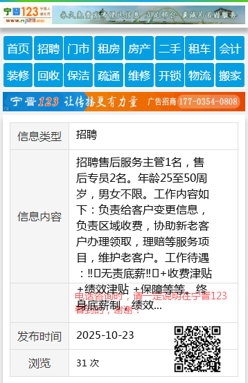 招聘售后服务主管1名,售后专员2名。年龄25至50周岁,男女不限。工作内容如下:负责给客户变更信息,负责区域收费,协助新老客户办理领取,理赔等服务项目,维护老客户。工作待遇:‼️无责底薪‼️+收费津贴+绩效津贴 +保障等等。终身底薪制,绩效上不封顶,工作时间相对自由。工作地点:桃山区欢迎自荐或者推荐电话或者微信: 张经理13945587907个人13945587907 【电话咨询时,请一定说明在七台河信息网看到的,谢谢!】 |