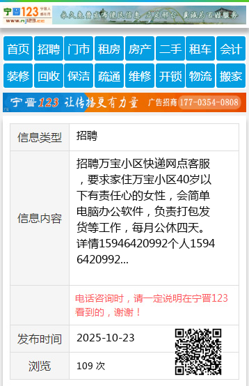 招聘万宝小区快递网点客服,要求家住万宝小区40岁以下有责任心的女性,会简单电脑办公软件,负责打包发货等工作,每月公休四天。详情15946420992个人15946420992 【电话咨询时,请一定说明在七台河信息网看到的,谢谢!】 |