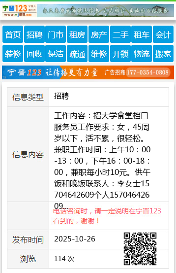 工作内容:招大学食堂档口服务员工作要求:女,45周岁以下,活不累,很轻松。兼职工作时间:上午10:00-13:00,下午16:00-18:00,兼职每小时10元。供午饭和晚饭联系人:李女士15704642609个人15704642609 【电话咨询时,请一定说明在七台河信息网看到的,谢谢!】 |