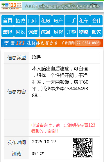 本人脑出血后遗症,可自理,想找一个性格开朗,干净利索,一天两顿饭,房子60平,活少事少李15344649888