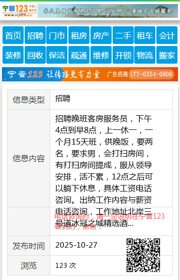 招聘晚班客房服务员,下午4点到早8点,上一休一,一个月15天班,供晚饭,要两名,要求男,会打扫房间,有打扫房间提成,服从领导安排,活不累,12点之后可以躺下休息,具体工资电话咨询。出纳工作内容与薪资电话咨询,工作地址北岸三号道冰冠之城精选酒店,家住北岸优先。芦女士19303674700 【电话咨询时,请一定说明在七台河信息网看到的,谢谢!】 |