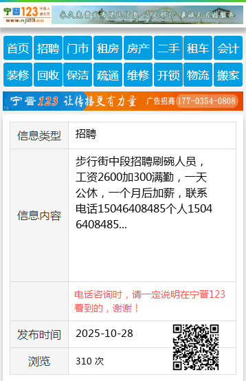 步行街中段招聘刷碗人员,工资2600加300满勤,一天公休,一个月后加薪,联系电话15046408485个人15046408485 【电话咨询时,请一定说明在七台河信息网看到的,谢谢!】 |