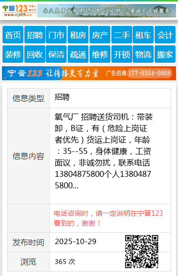 氧气厂 招聘送货司机:带装卸,B证,有(危险上岗证者优先)货运上岗证,年龄:35--55,身体健康,工资面议,非诚勿扰,联系电话13804875800个人13804875800 【电话咨询时,请一定说明在七台河信息网看到的,谢谢!】 |